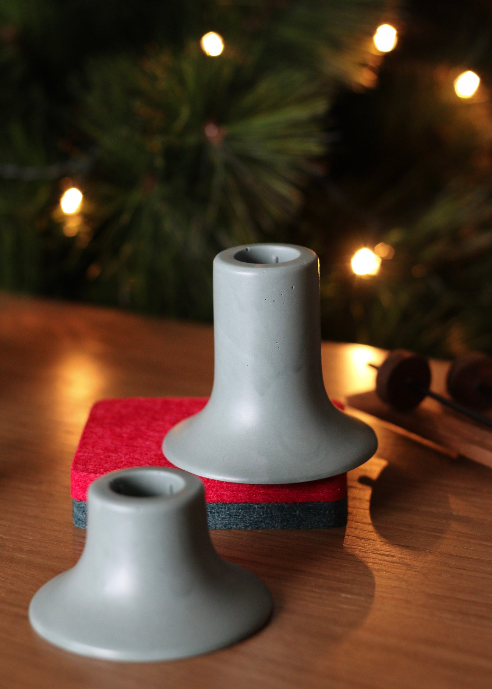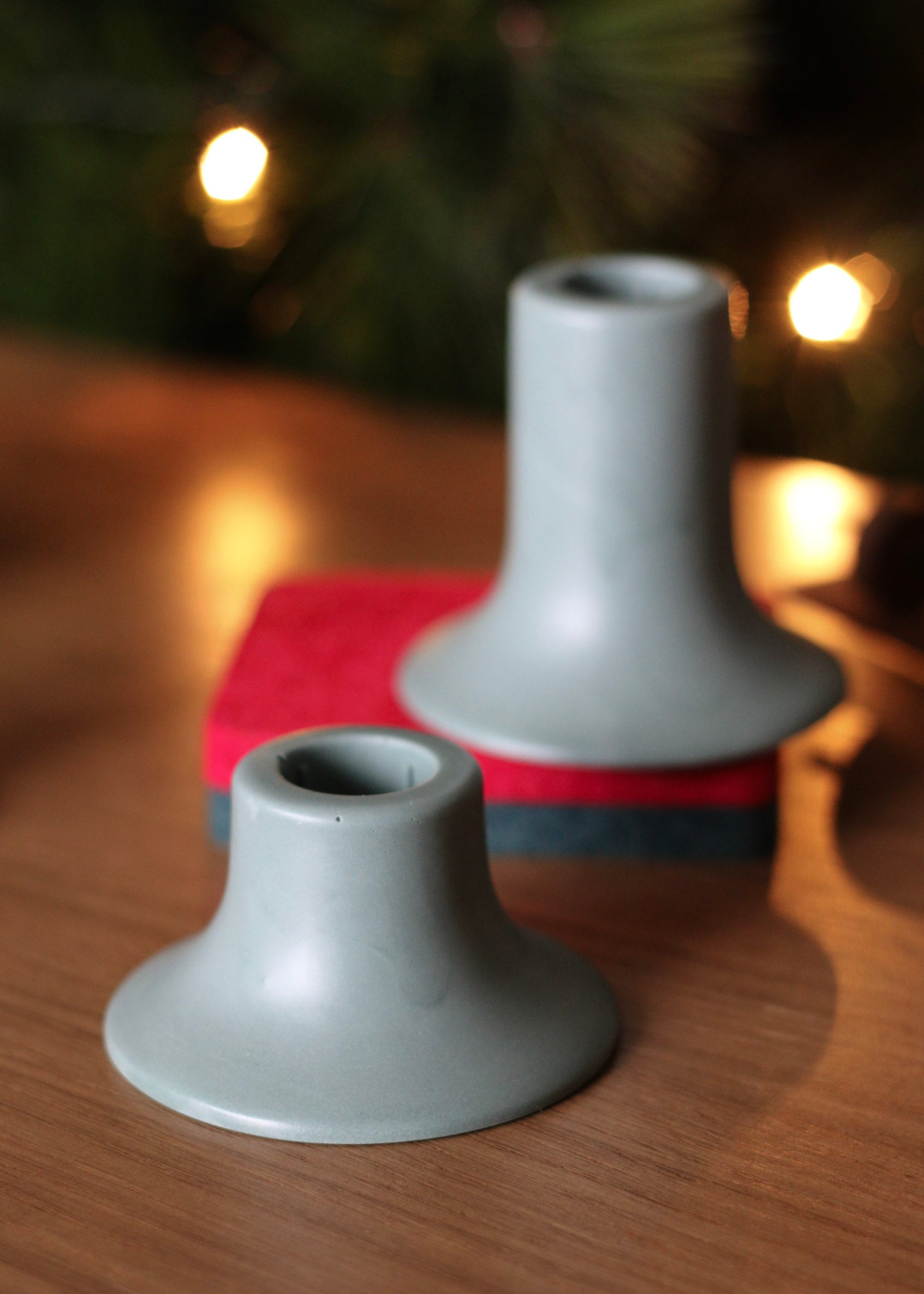 Com linhas suaves e base geométrica, é uma peça que equilibra simplicidade e elegância, feita à mão em jesmonite nas cores vermelho e verde, típicas da época mas reinterpretadas com um ar contemporâneo.