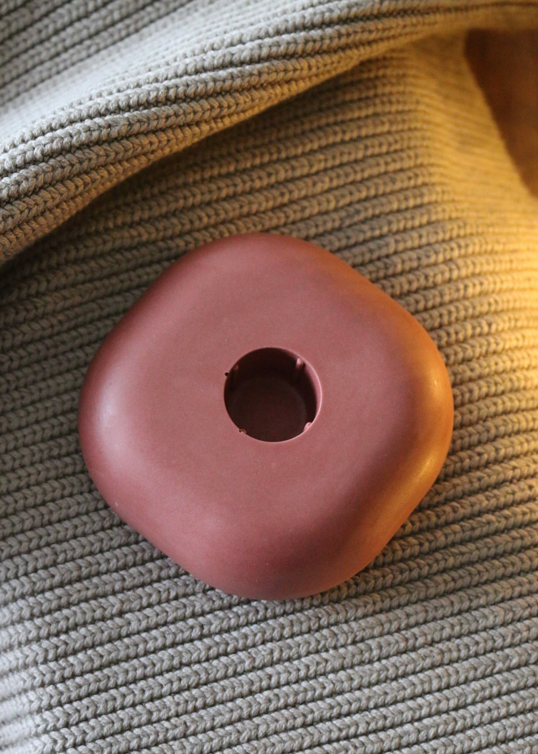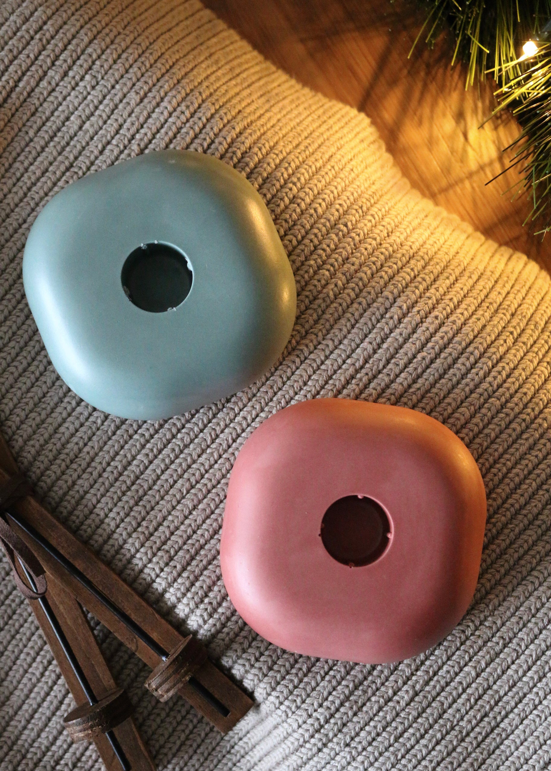 Feito à mão em jesmonite, combina textura acetinada e cores natalícias — verde e vermelho — que se adaptam tanto a decorações minimalistas como às mesas mais festivas da época.