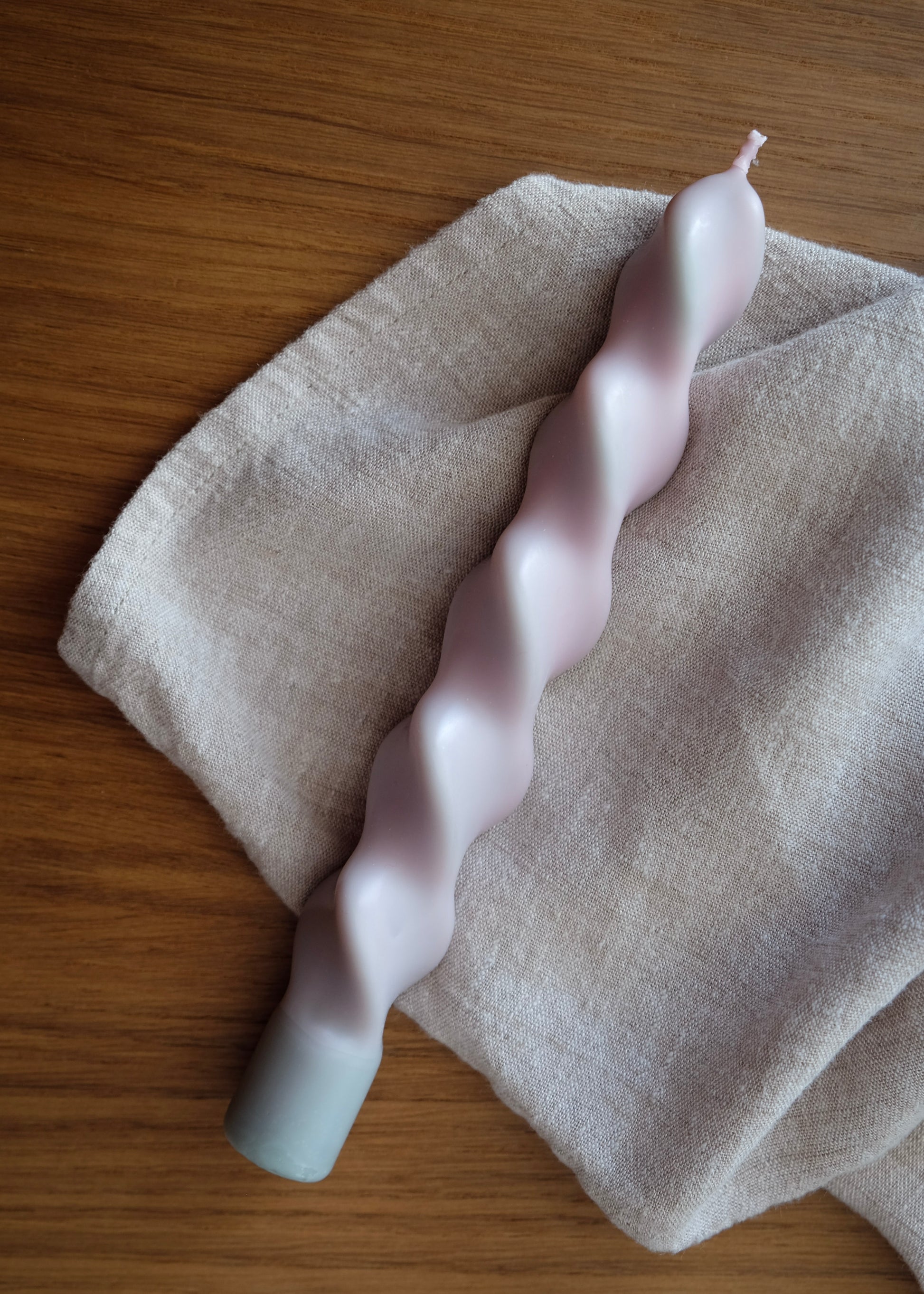 A Vela Movimento traz um design ondulado e fluido que se destaca em qualquer espaço. Nesta versão bicolor, o exterior rosa claro revela um interior verde ao acender, criando contraste visual e surpresa durante a queima.