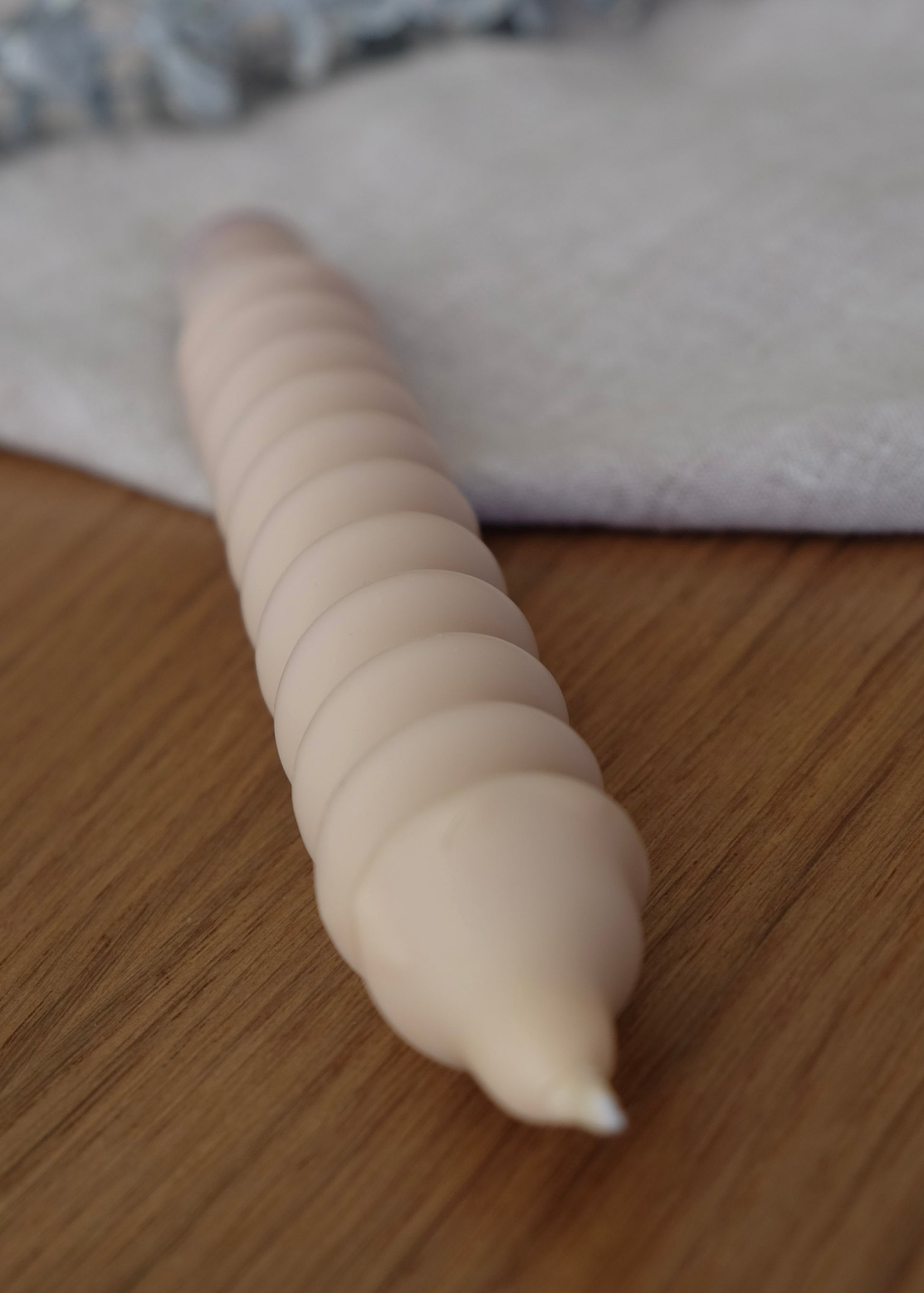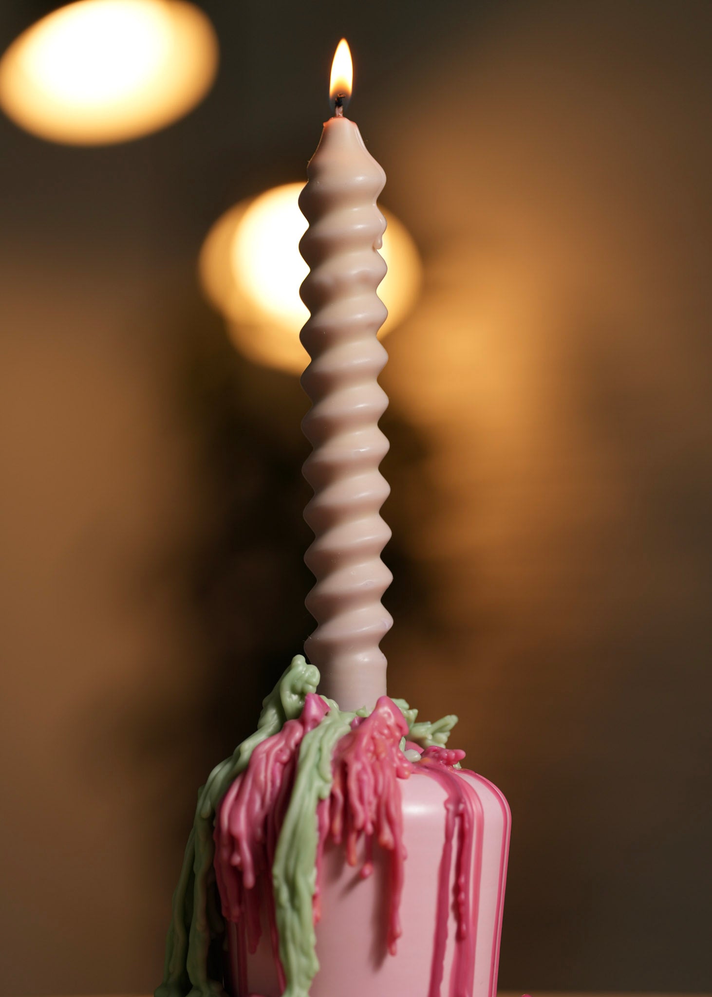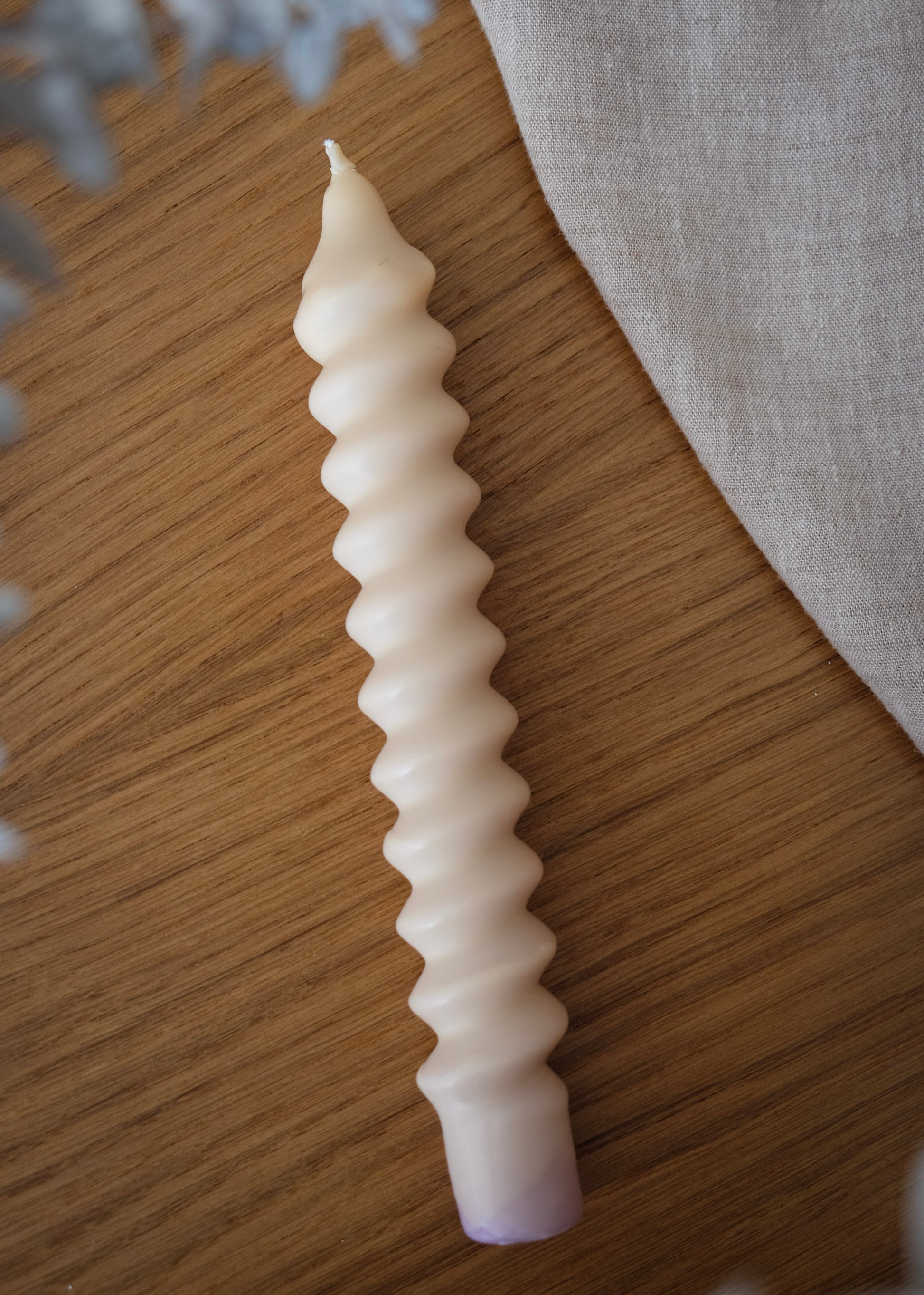 Uma vela que respira suavidade e frescura. O tom baunilha no exterior dá aquele ar leve e neutro que combina com qualquer espaço, enquanto o interior em lilás surpreende com um toque de cor delicada. O design em ziguezague torna-a numa peça que chama a atenção, mesmo antes de ser acesa.